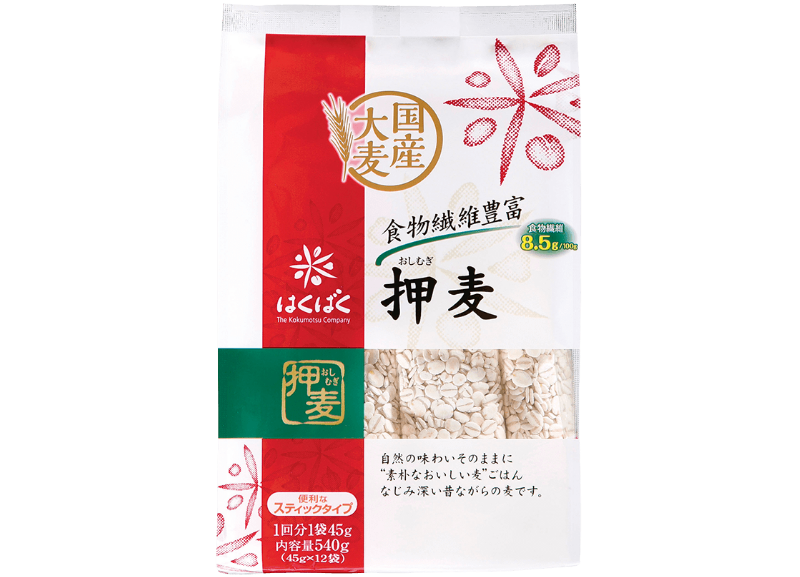 スティックタイプ:¥380(45g×12袋) 最もスタンダードな麦です。粒の真ん中にある黒条線が特徴で、蒸気に当てた後、ローラーで圧扁しています。よく「麦とろ」などに利用される素朴な麦です。