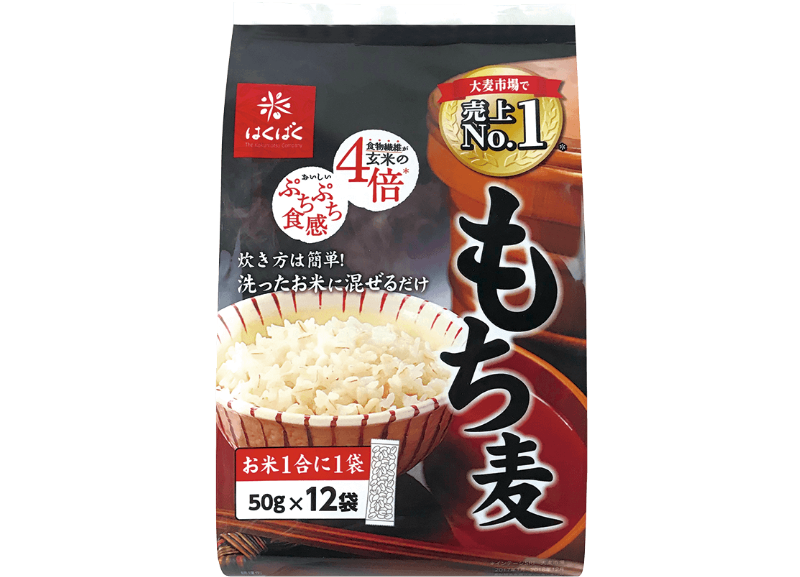 ・お米にうるち米ともち米があるように「もち麦」はもち性の大麦です。 ・もち麦は穀類の中でも食物繊維の含有率が高く、食品として見直されつつあり、特に水溶性の食物繊維が米や小麦に比べて多く含まれています。